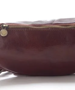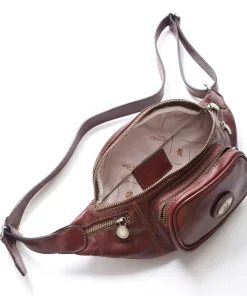 Marsupio artigianale 100% Made in Italy realizzato in vero cuoio Toscano, con cinturino in pelle e tre tasche davanti e una dietro con chiusura a zip.